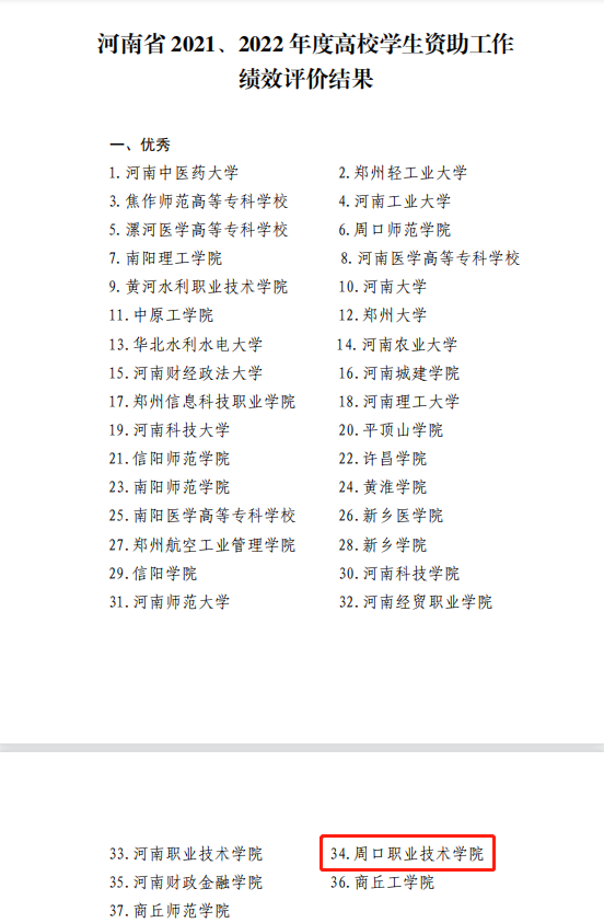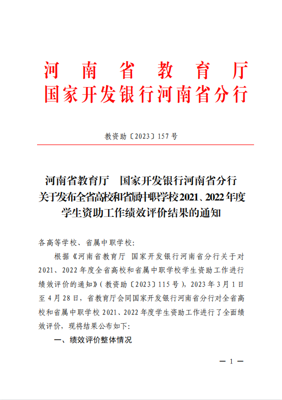 近日,河南省教育厅、国家开发银行河南省分行联合印发了《关于发布全省高校和省属中职学校2021、2022年度学生资助工作绩效评价结果的通知》,谈球吧体育在此次全省学生资助工作绩效评价中被评为“优秀”等级。